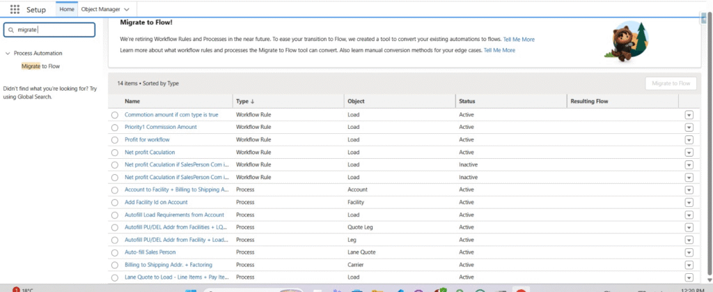 When you go to Setup and search for “Migrate to Flow”, Salesforce automatically shows a list of all active Workflow Rules and Processes.