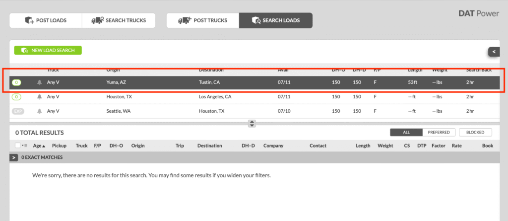 You can now see your search results in the table and convert each record into a Lane Quote or a Load.