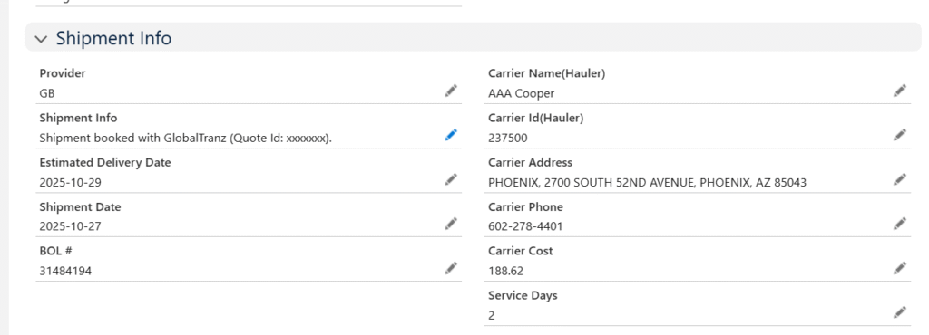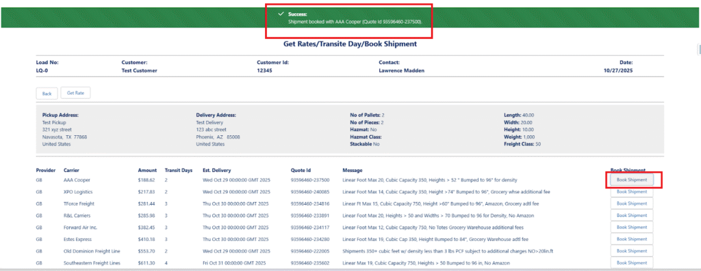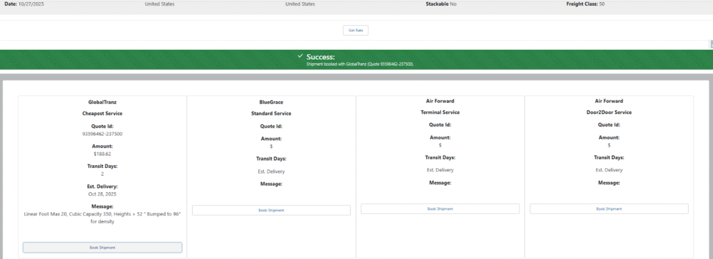 - Click “Book Shipment” beside desired quote → run GlobalTranzBookShipment.createShipmentForLoad().