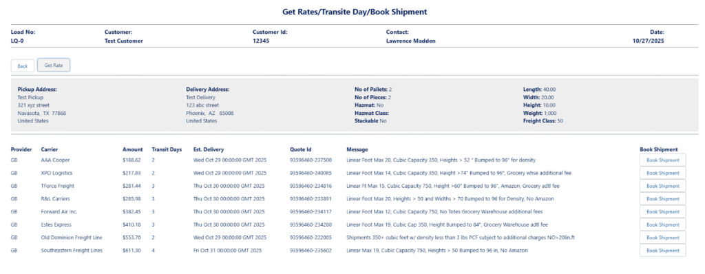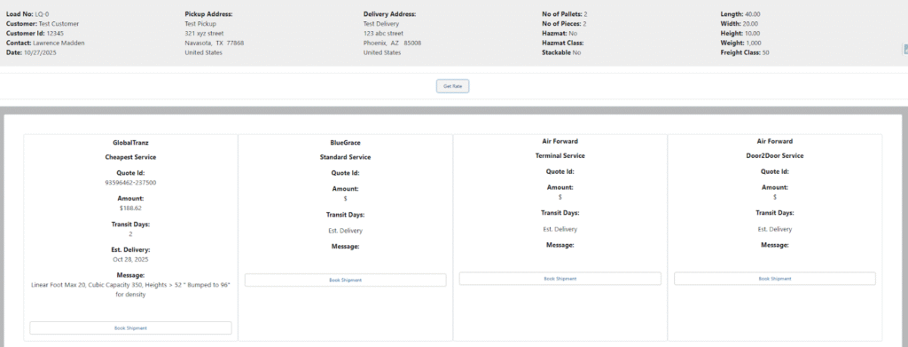 - Click “Get Rate” → invokes GlobalTranzLtlRateRequest.getRatesForLoad().