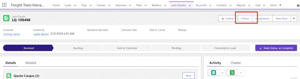 Integrate FTM with Primus REST API to request LTL rate quotes and book shipments directly from the Lane Quote page in Salesforce.