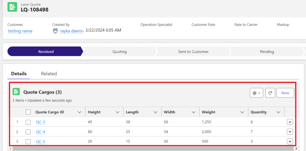 ✅ Verify Lane Quote field mappings and Quote Cargo child records